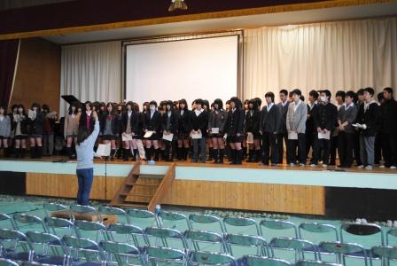 本日は午前中に学年末考査の答案返却を行い、そのあと6日の卒業式準備でした。 写真は1・2年生の合唱練習です。6日の卒業式に向け、3年生を送る準備が進んでいます。