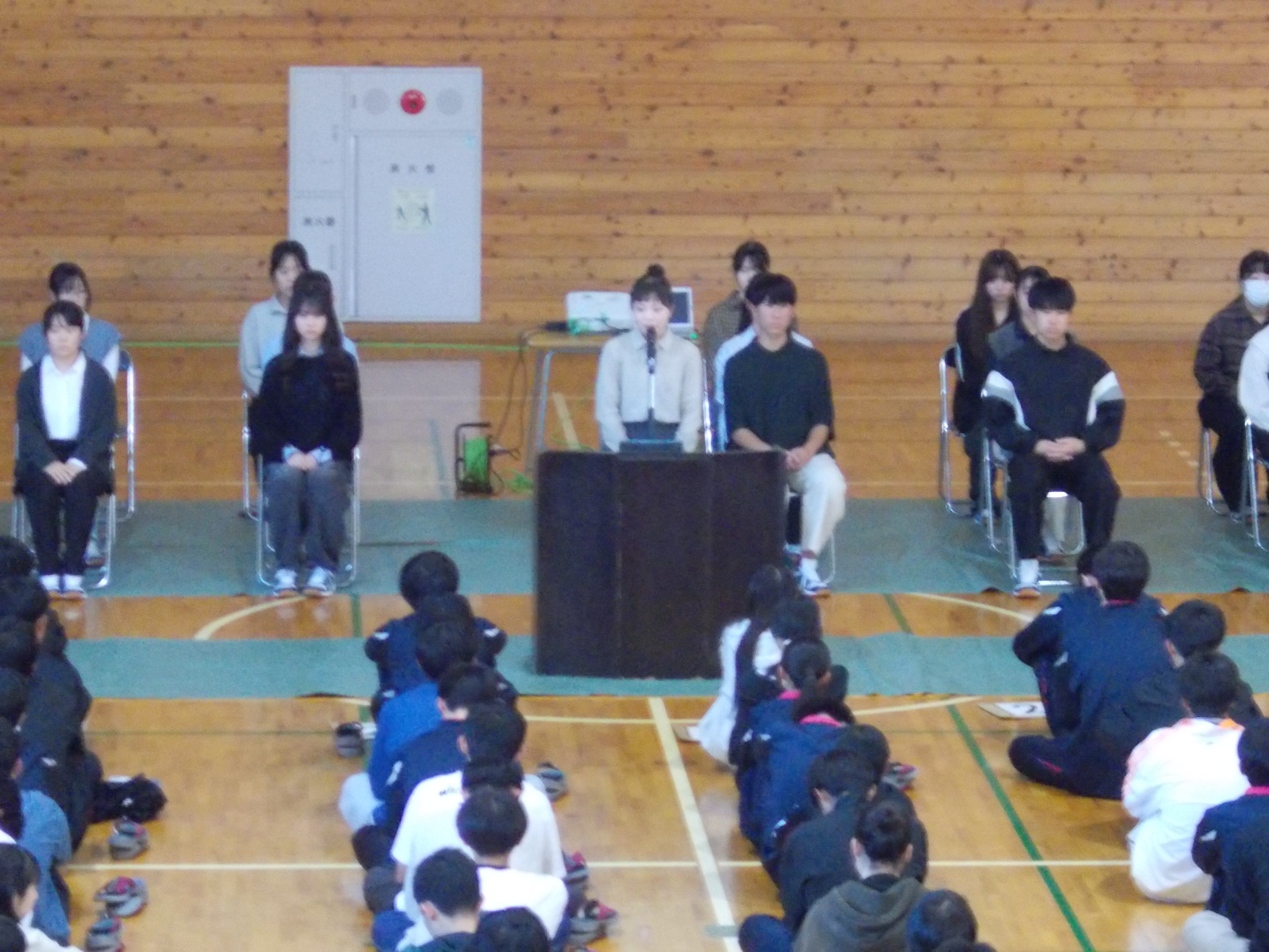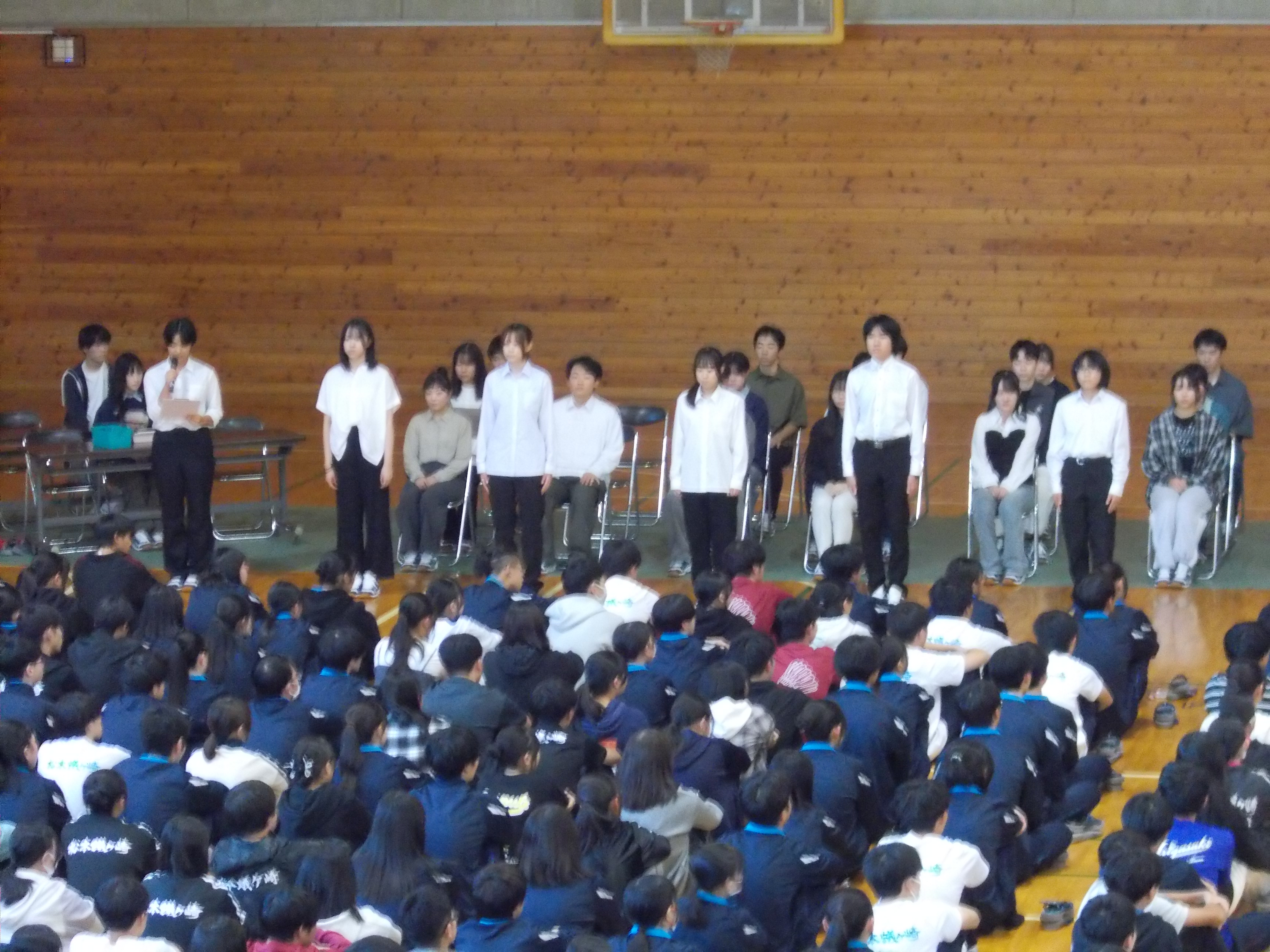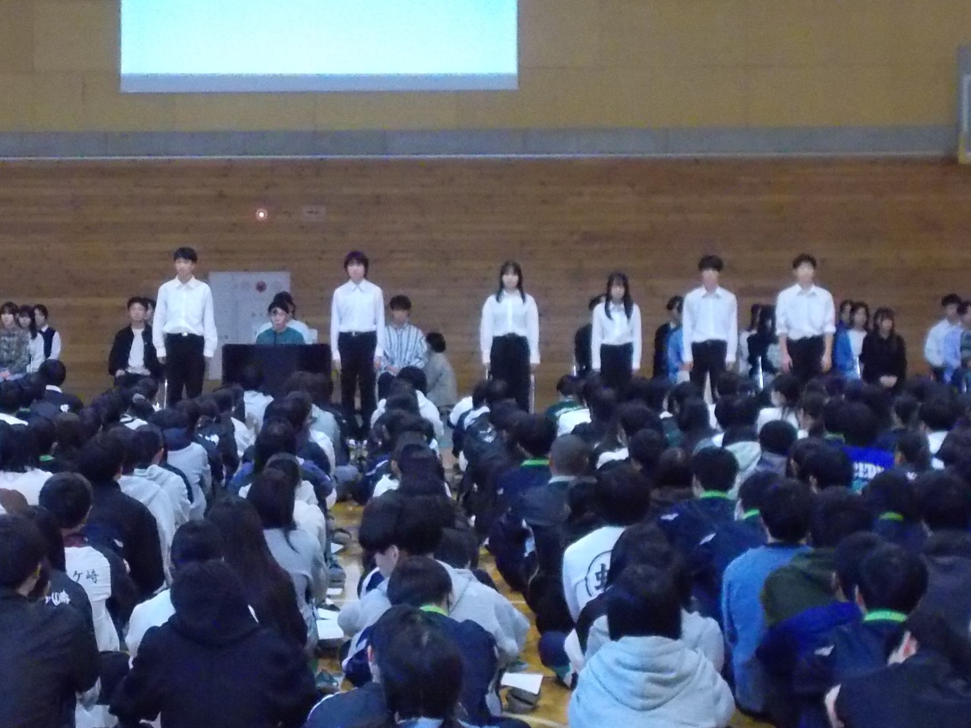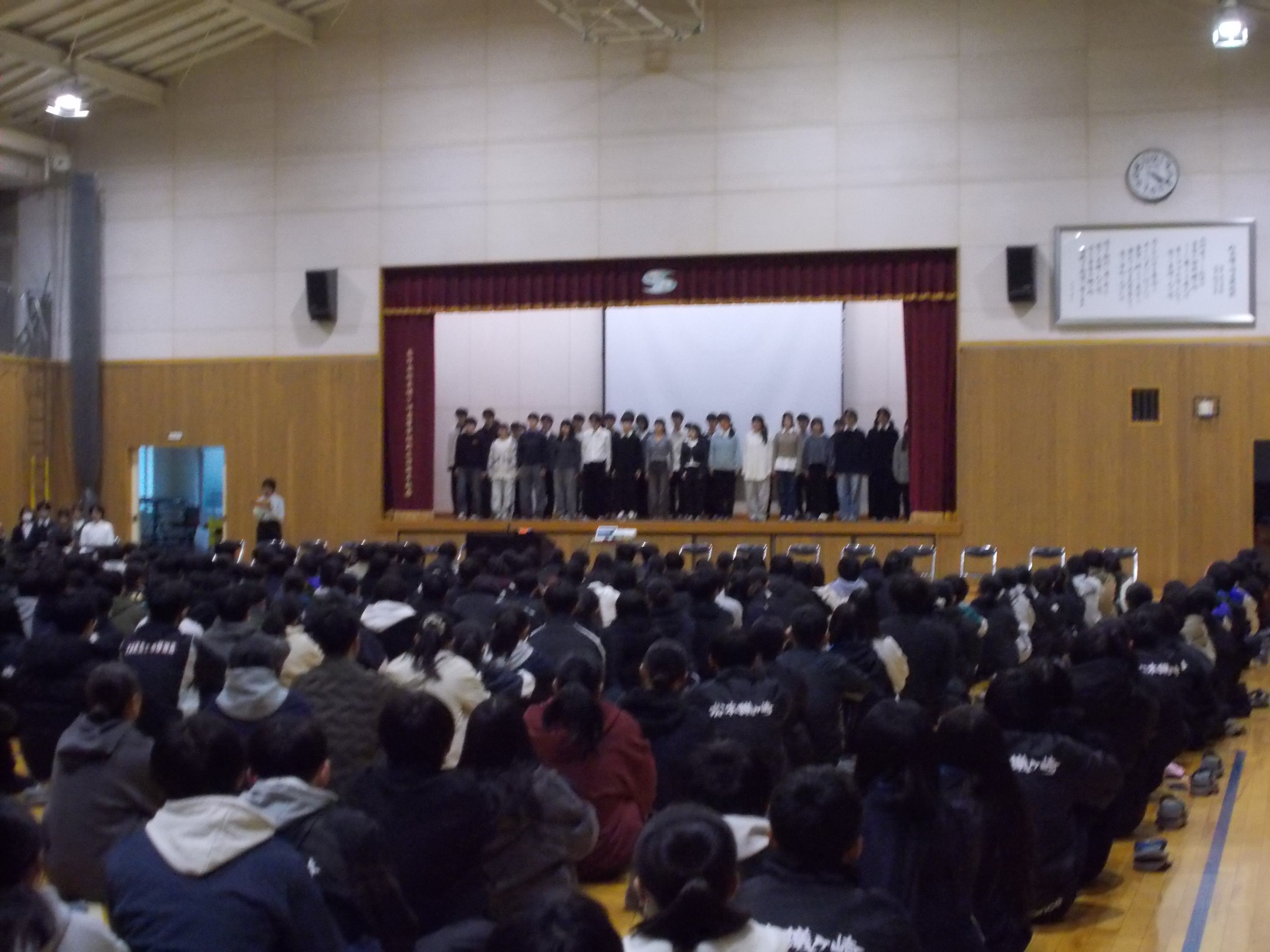 部活動によるパフォーマンス披露や1,2年生全体で「さくら」の合唱を行いました。