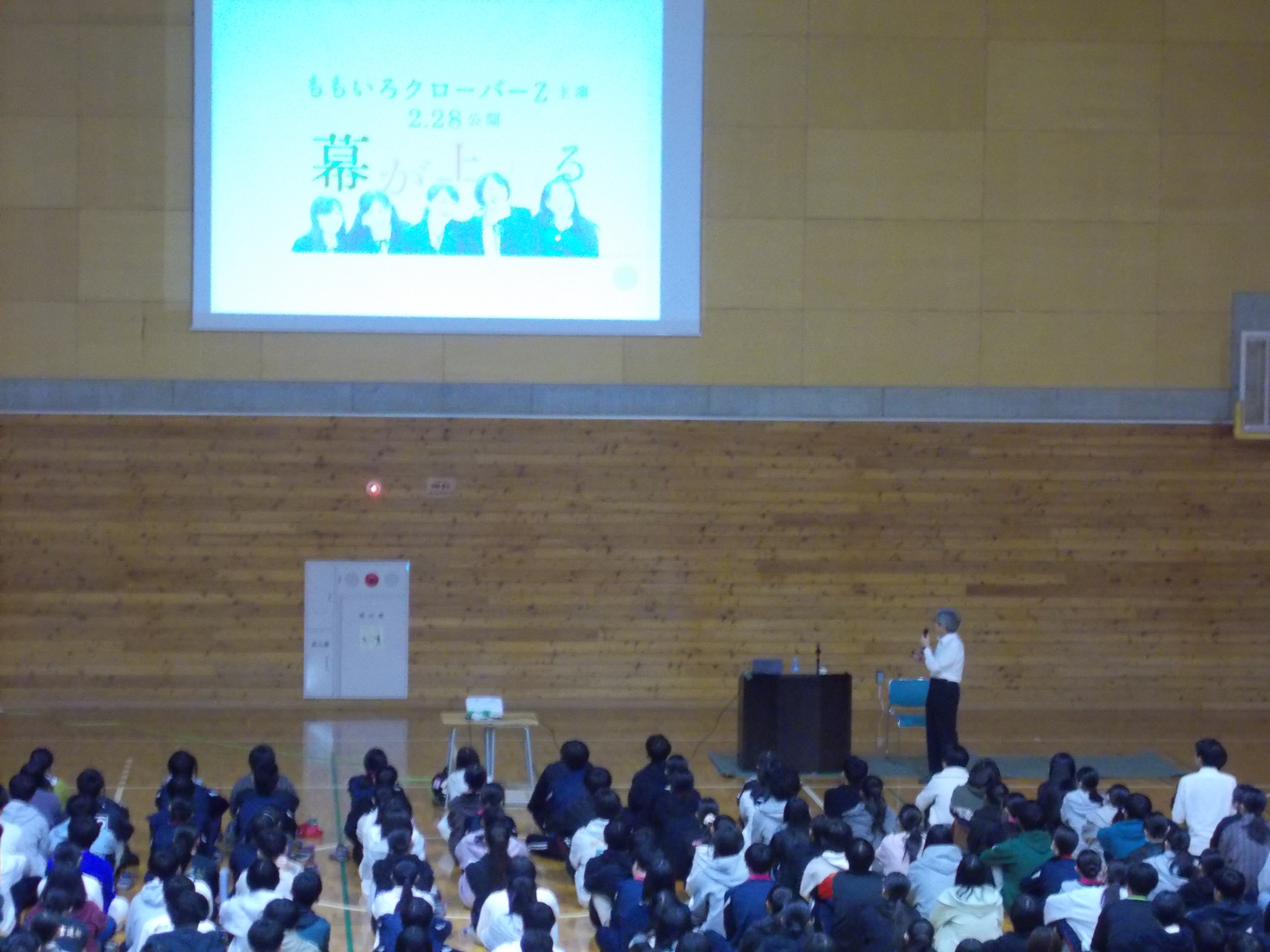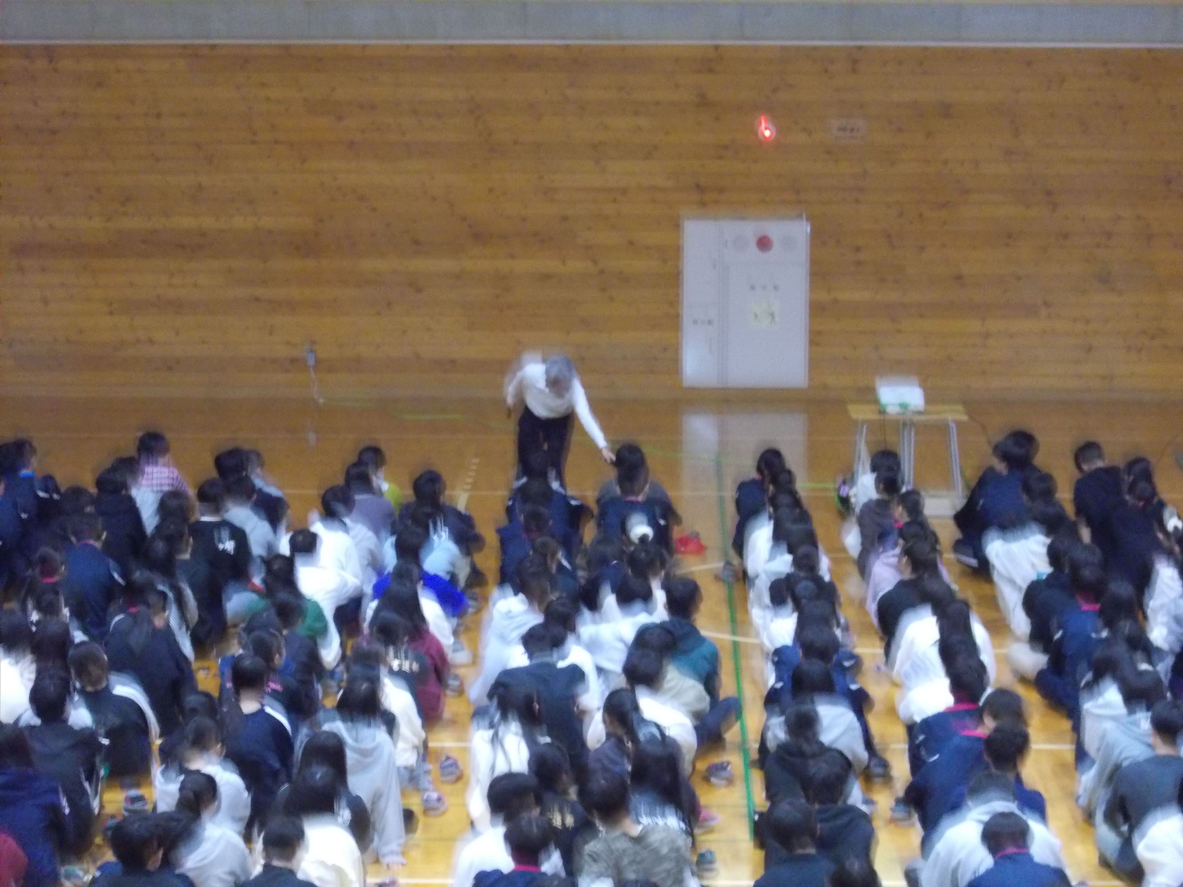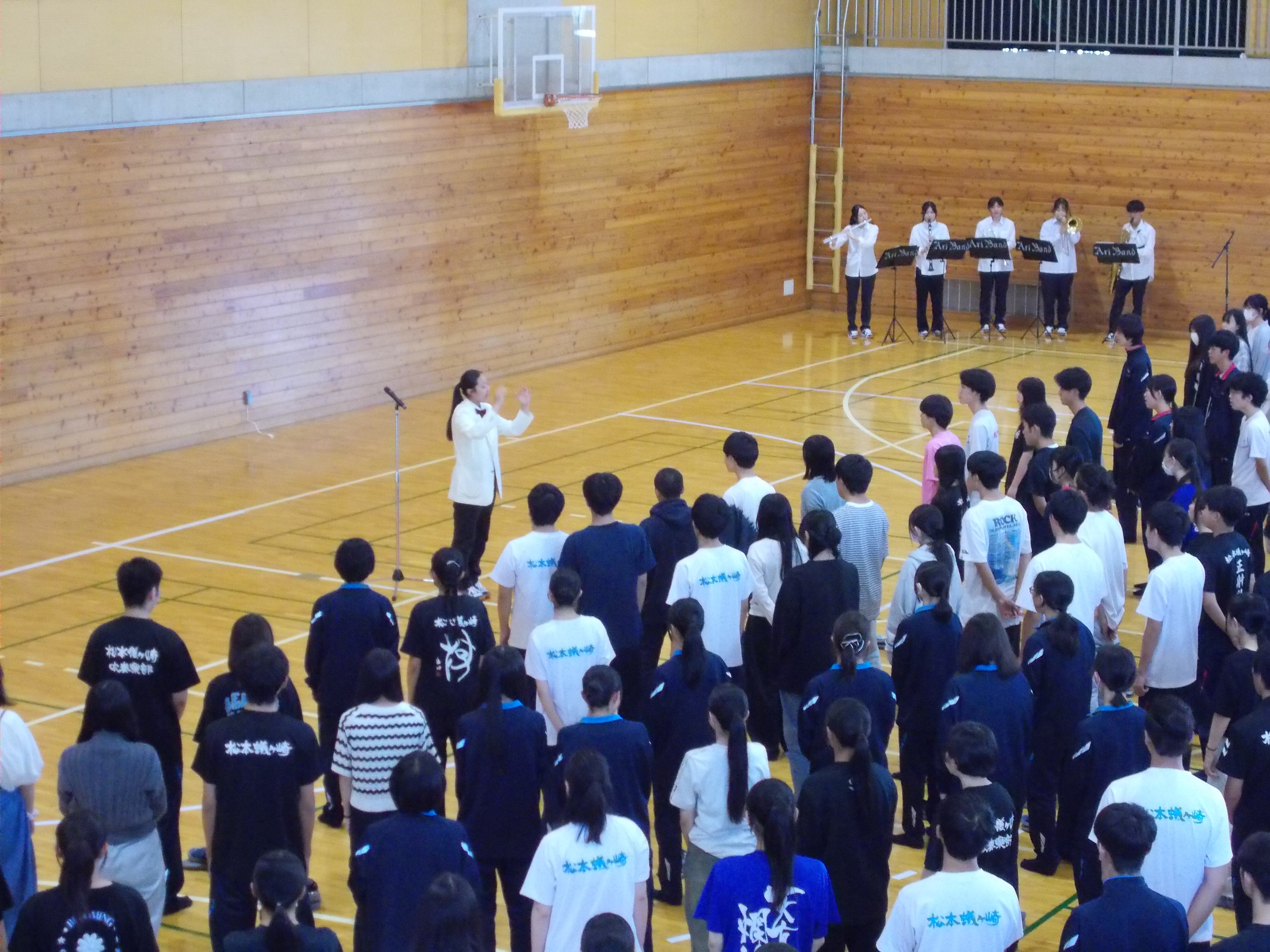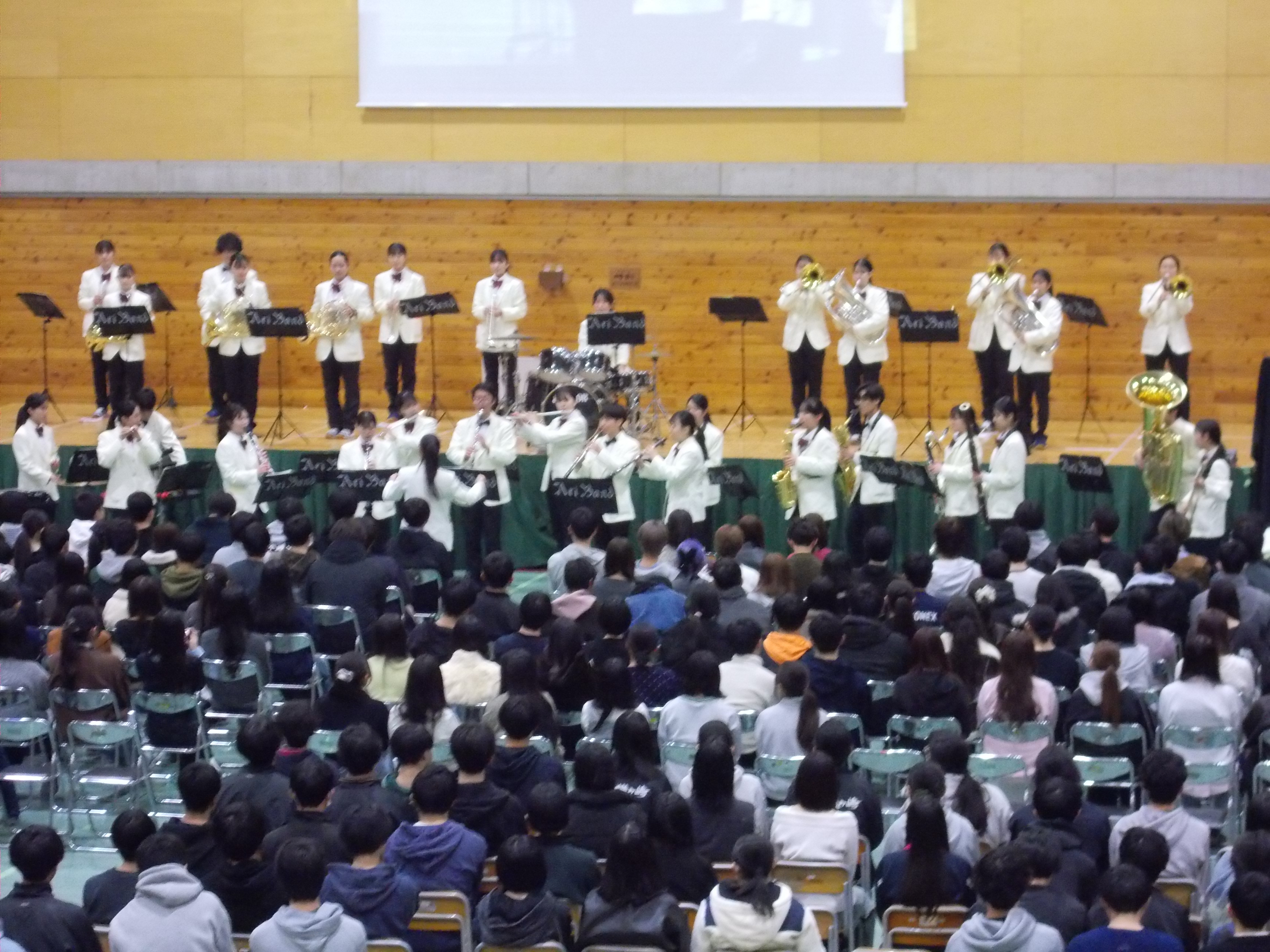 部活動によるパフォーマンス披露や1,2年生全体で「さくら」の合唱を行いました。