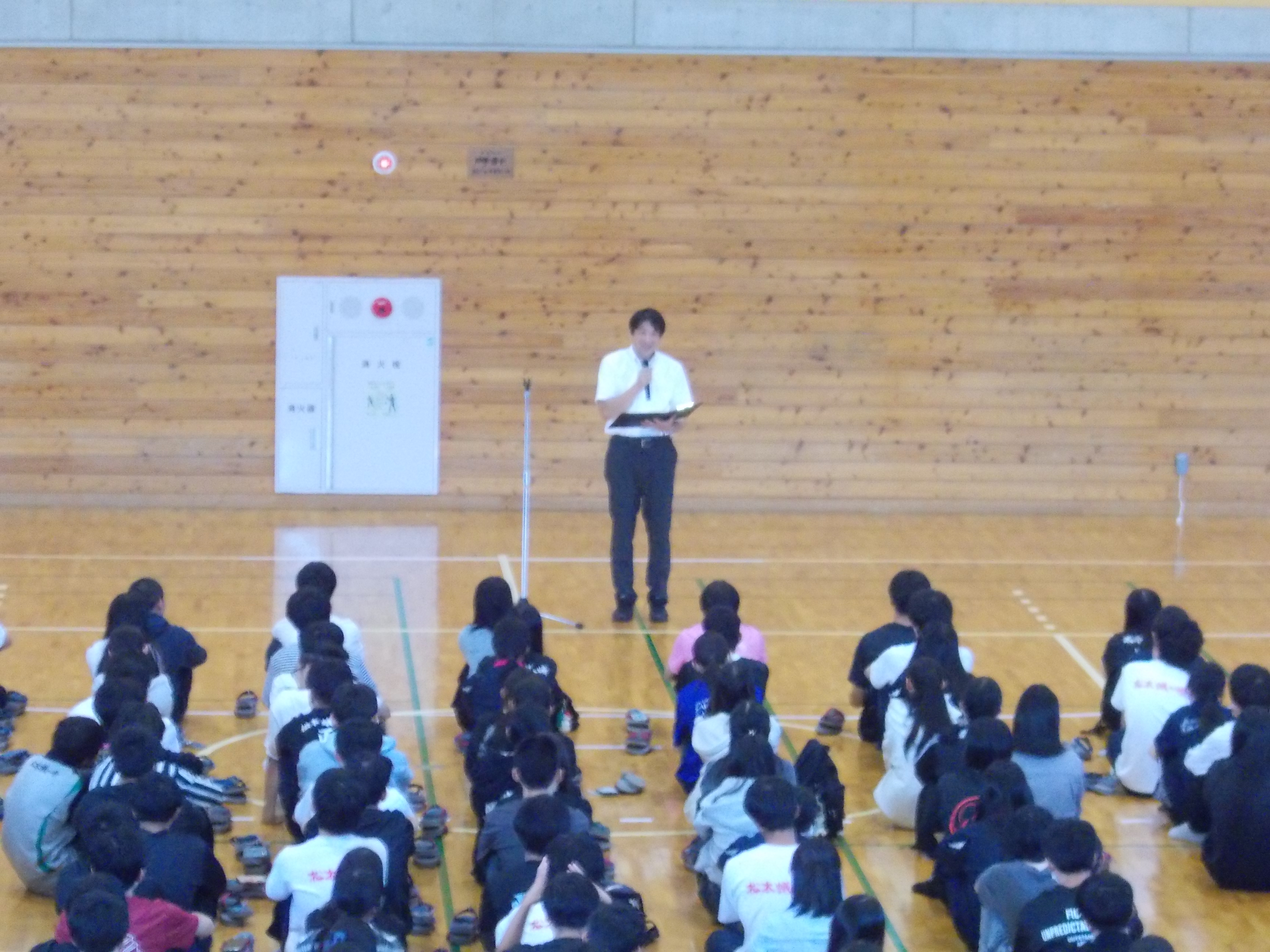 定期考査Ⅱを終えた今日で前期が終了となりました。終始業式では教頭先生の講話を聞き、全校で校歌を歌い、後期に向けて気持ちを引き締めました。また、8月からALTとして来られたBen先生の紹介がありました。Ben先生これからよろしくお願いします!