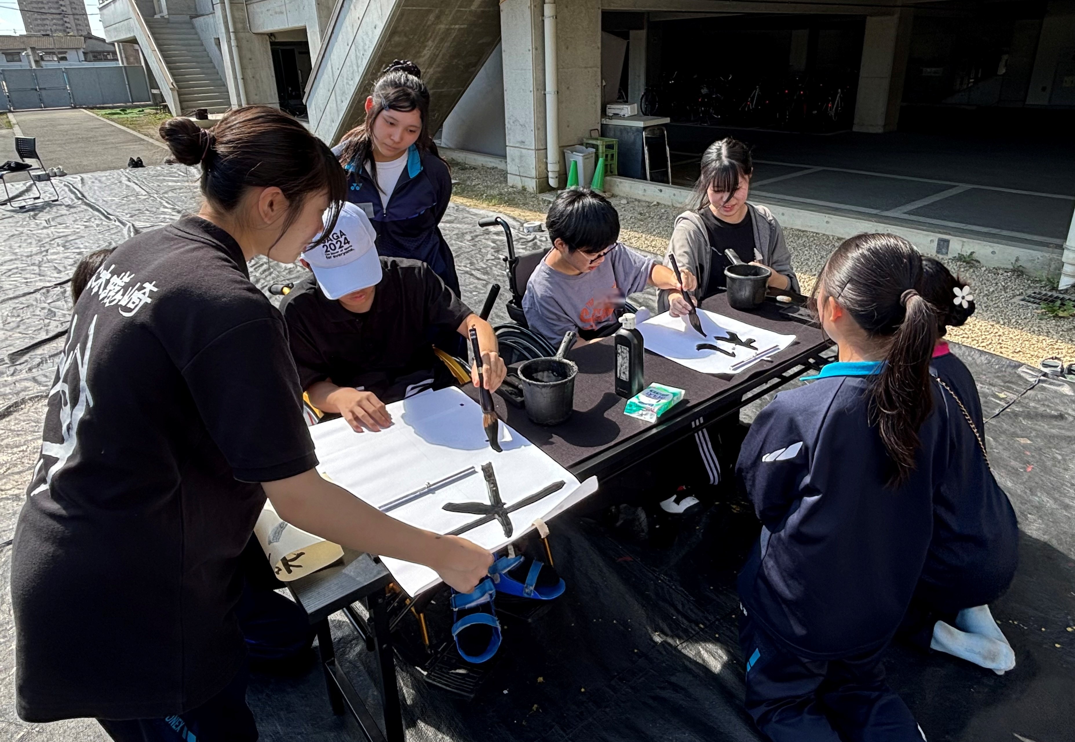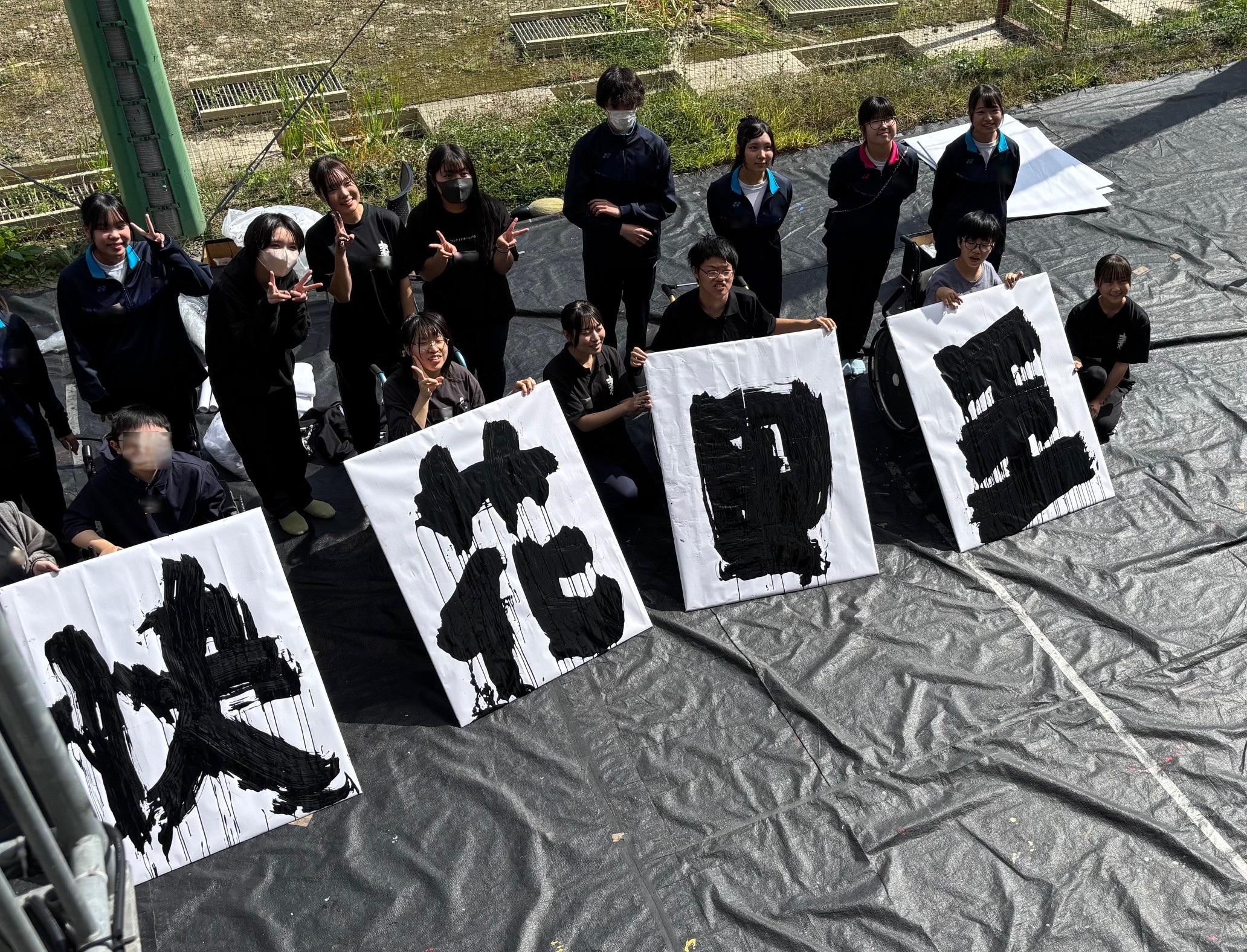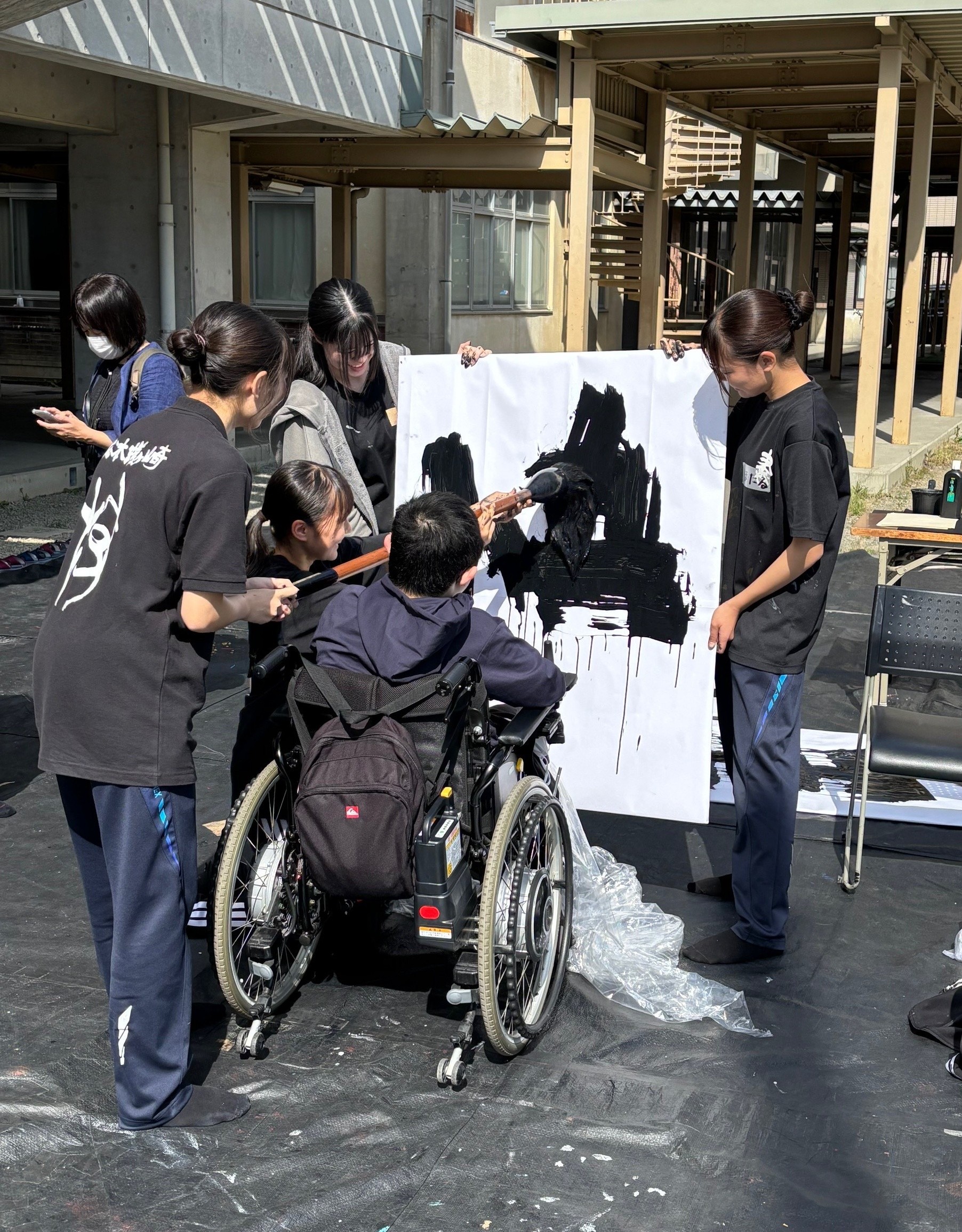 花田養護学校高等部の生徒さん4名が来校し本校の書道部、JRCクラブの生徒と交流ました。グループで大筆を使った書にも挑戦しました。1時間という短い時間ではありましたが、とても良い時間になりました。