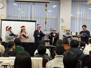 今日は放課後に図書委員会主催したクリスマス会が行われ、合唱部、放送部、インターナショナル部の発表やビンゴ大会を行いました。最後にはサンタクロースからのサプライズプレゼントもありました。計画していただいた図書委員会の皆さん、ありがとうございました!