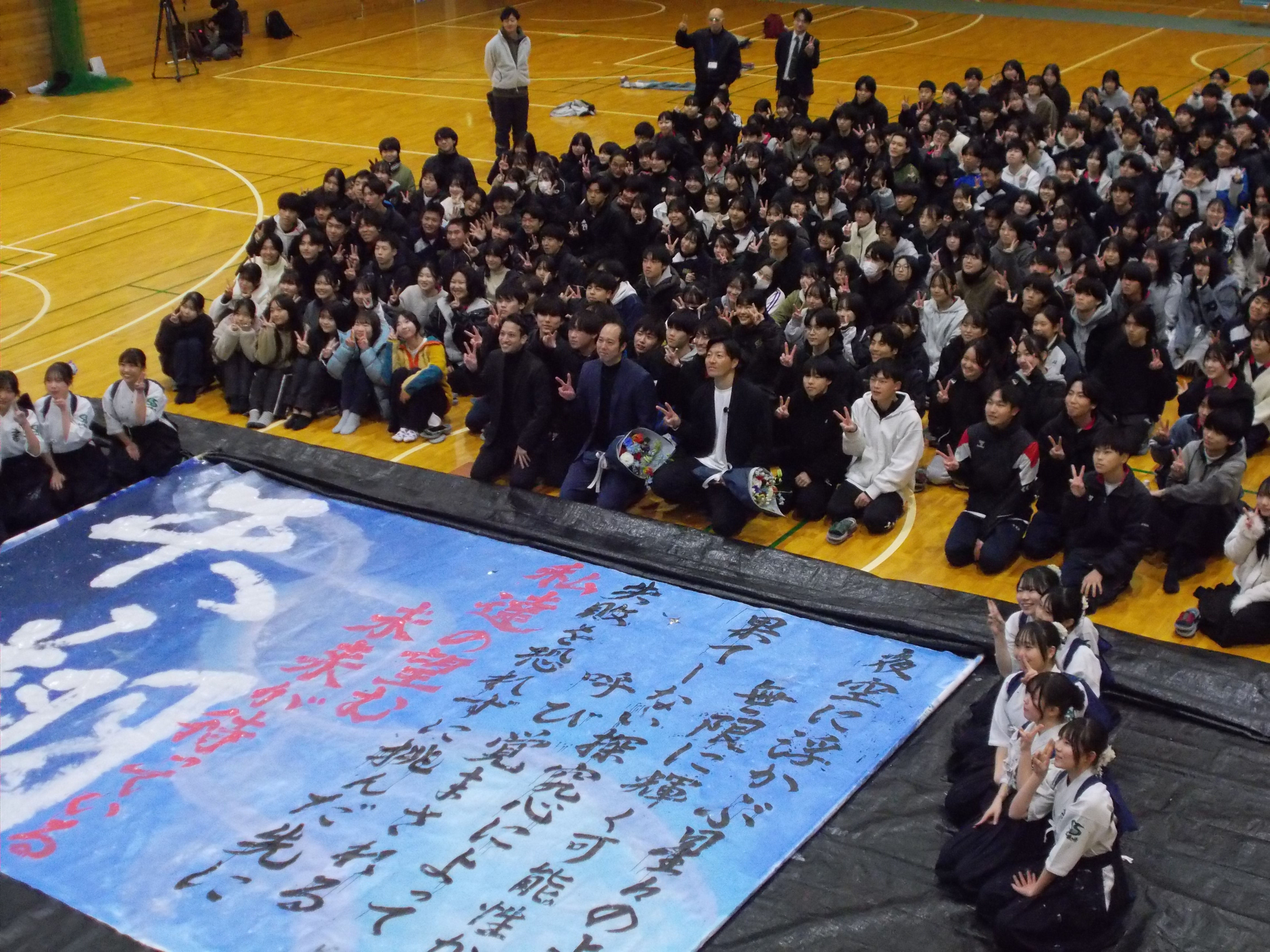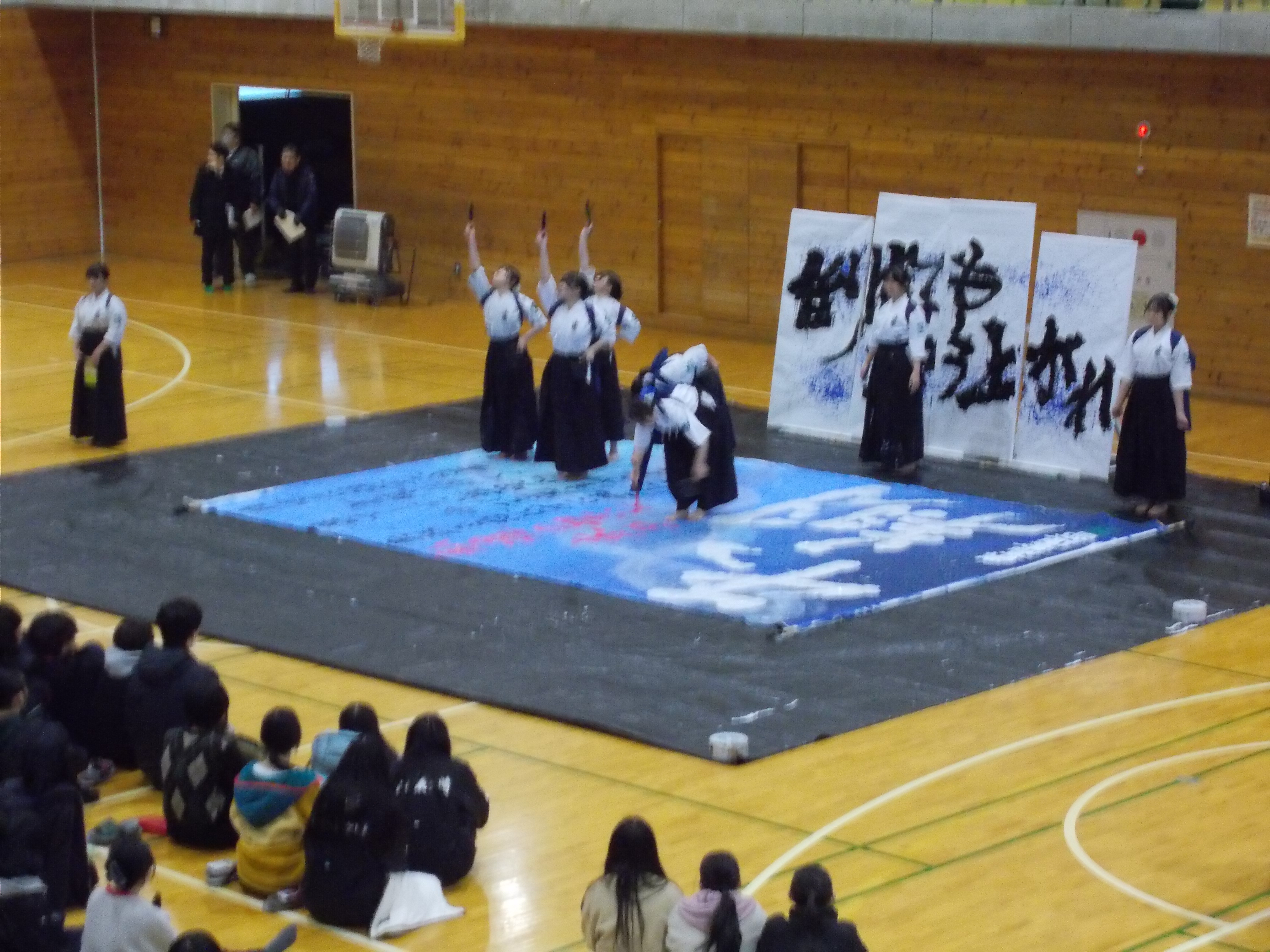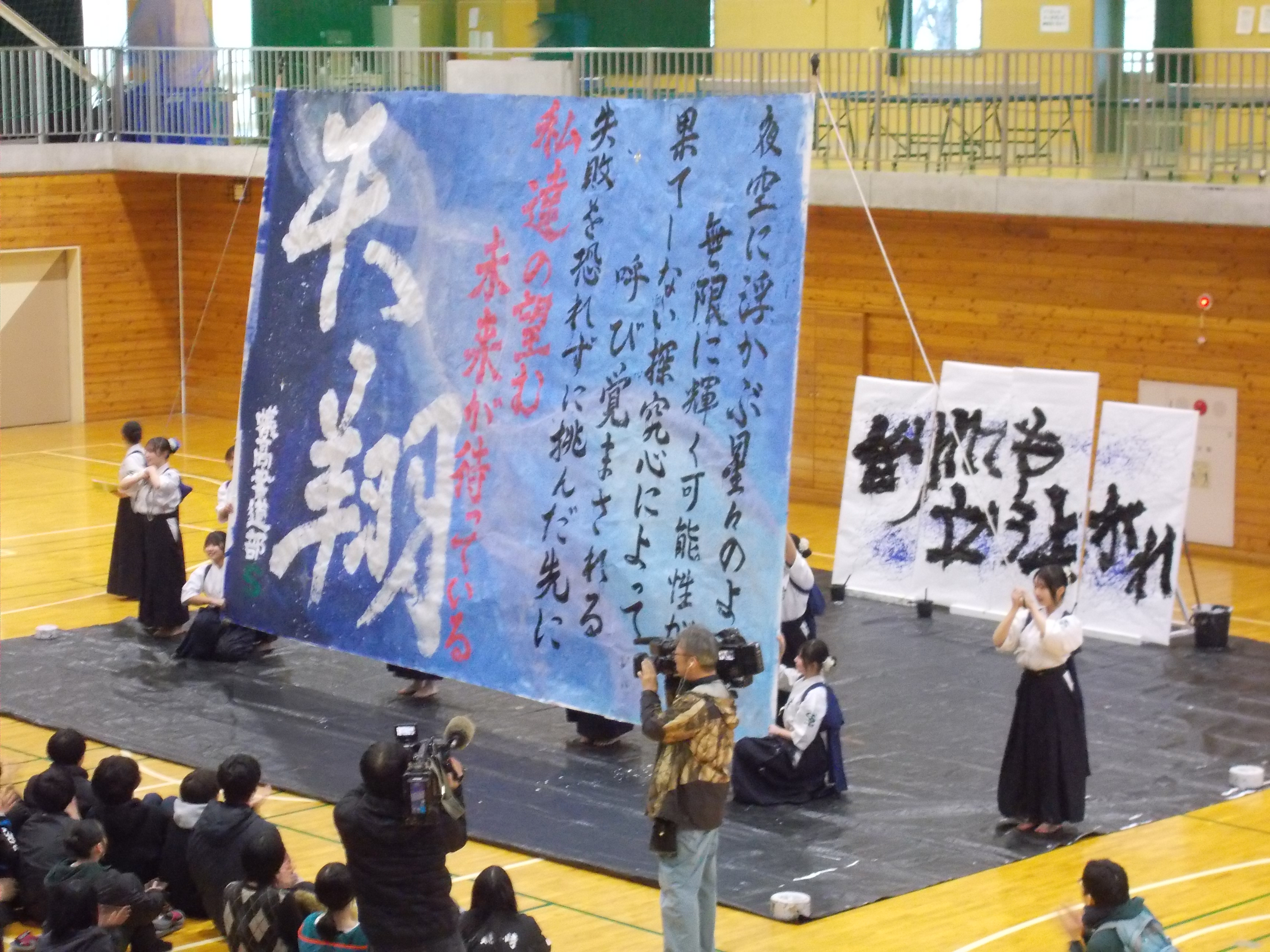 本日は書道部の「書道パフォーマンス甲子園 in EXPO」優勝と「第 18 回書道パフォーマンス甲子園全国大会」準優勝を祝して報告会を行いました。