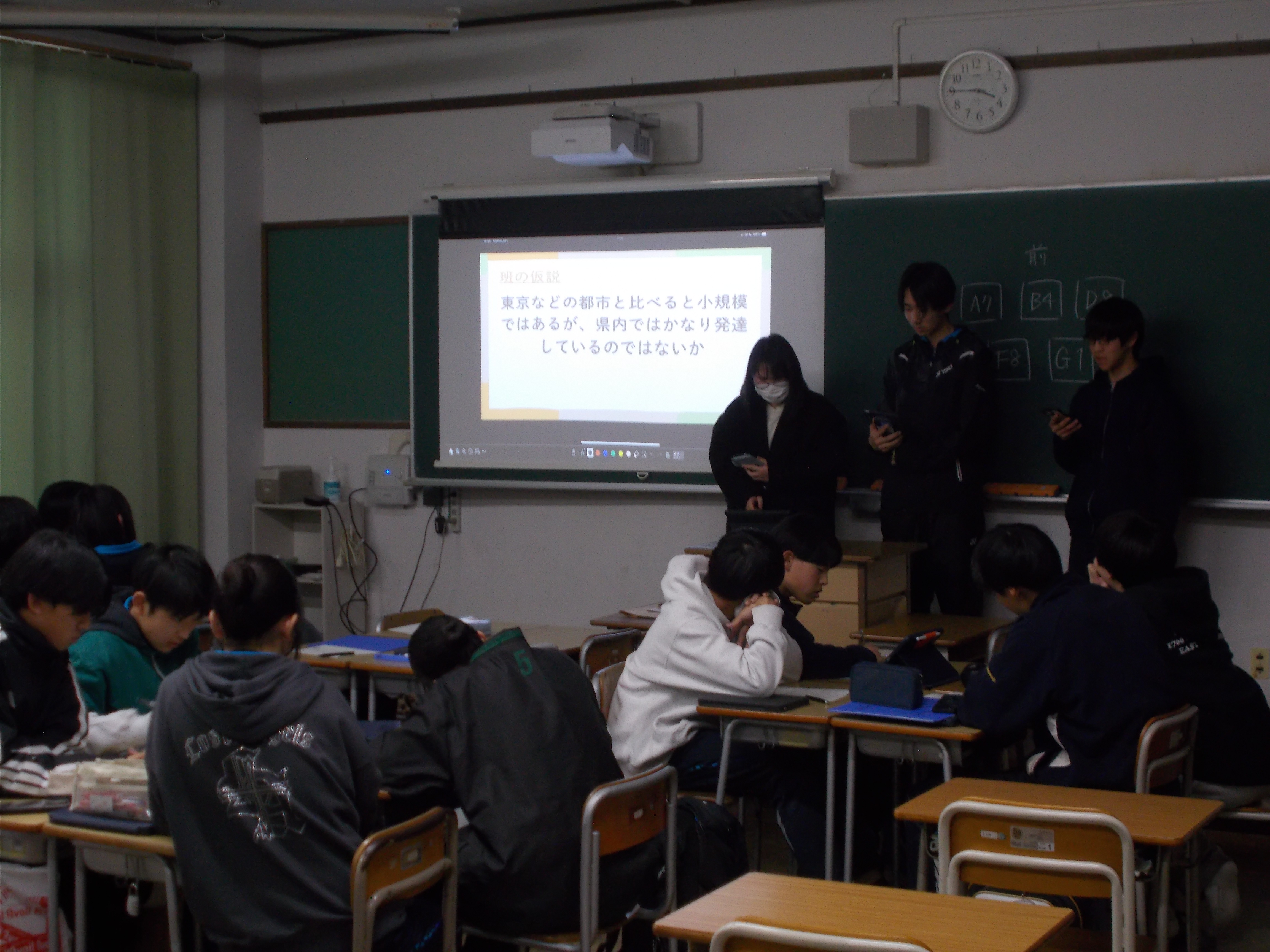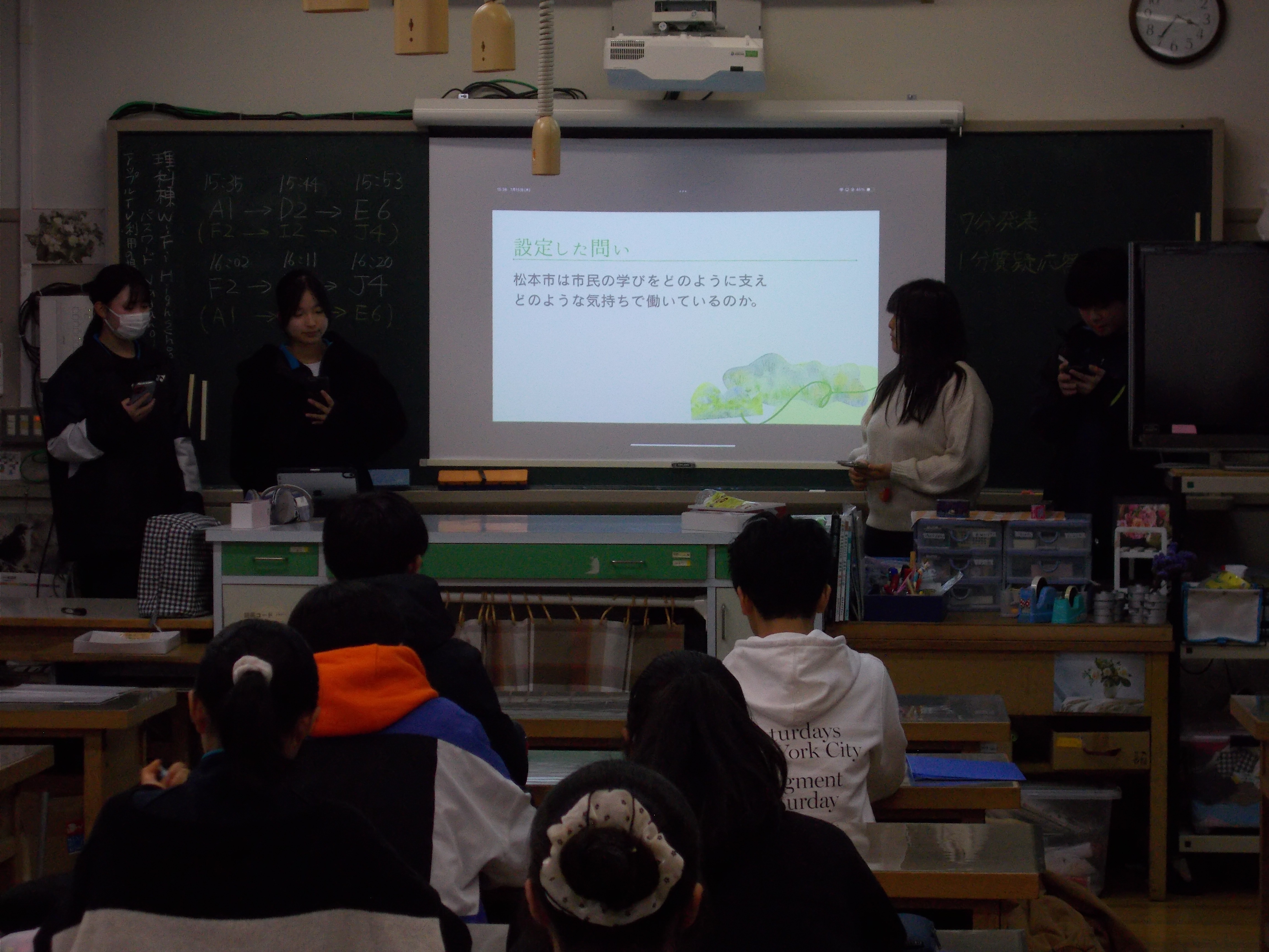 1年生は探究の時間に10月に行った松本探究の発表会を行いました。グループごとに立てた問について、工夫を凝らした発表スライドなどを使用し発表を行いました。