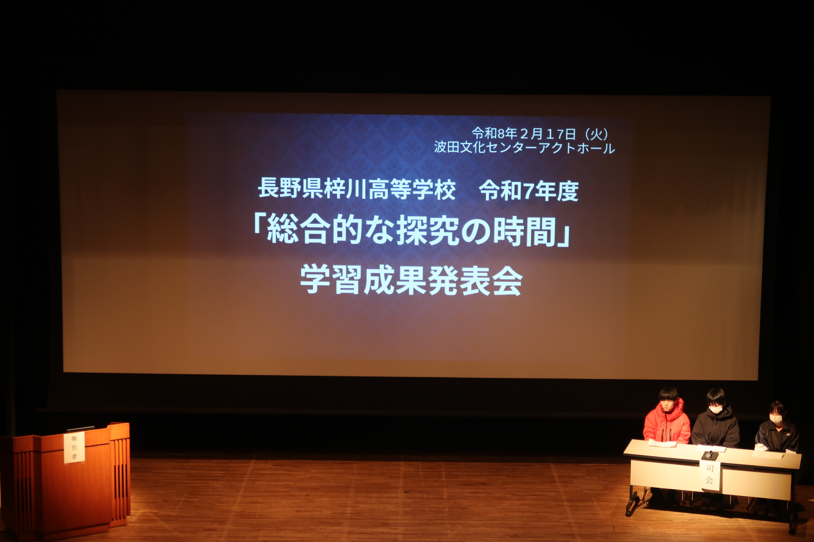 令和7年度 「総合的な探究の時間」学習成果発表会 2月17日(火)、「総合的な探究の時間」の学習成果発表会が波田アクトホールにて行われました。 今年度は、1年生はインターンシップで職業体験のまとめを発表し、2学年は、松本市議会との交流の成果と修学旅行で感じたことや学んだ事を、3年生は、3年間の市議会との交流事業の総括を発表しました。上級生は、自分達の言葉でしっかりと探究の成果を発表し見応えのある内容でした。
