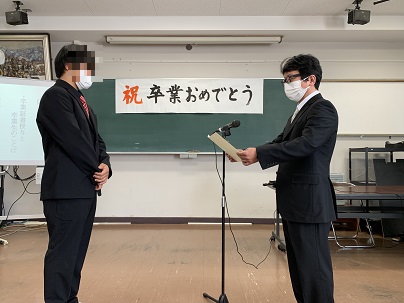 卒業証書を担任の先生より卒業生一人一人へ学校長代読にて授与しています。
