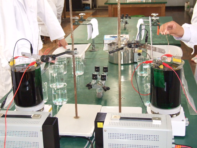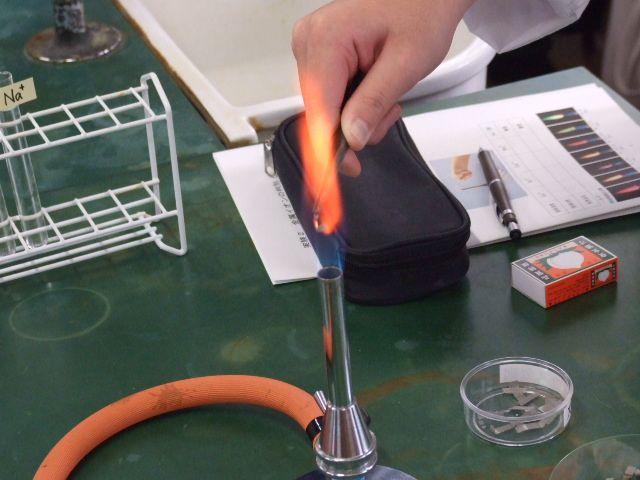 今年はめっき処理の実験、炎色反応の実験を体験しました。めっき処理は銅板にニッケルのめっき処理をおこない、銀色のブローチに変身させる実験です。炎色反応の実験では金属イオンの成分を知るために5種類の試料を高温の炎に入れて炎色を観察する実験です。左がメッキ処理をする溶液です。右はストロンチウムの炎色反応のです。赤い色が鮮やかでした。
