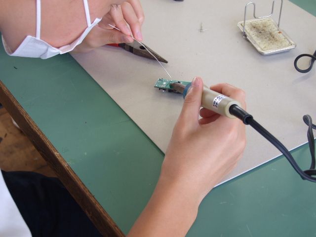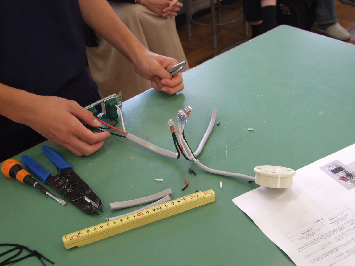 電気工事の実習、電子回路のハンダ付けの実習を行いました。左はLEDライトの電子回路にハンダ付けを行うところ、右は電線の先端を処理して、スイッチに取り付けてたところです。