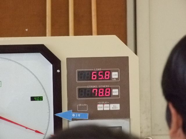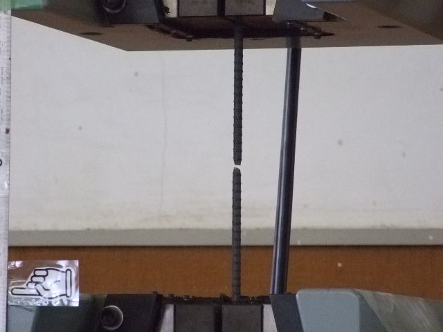 土木工学科では鉄筋の強度を知るために機械で鉄筋を引っ張り、どの程度の力で鉄筋が切断するのか実際に行ってみました。左は13mmの鉄筋を上下に引っ張っているところです。右は切断された鉄筋です。鉄筋が切断されるときにはバーンと音がして、その威力を実感できました。