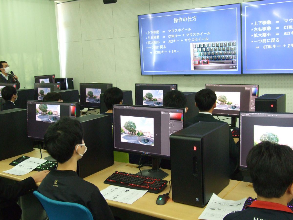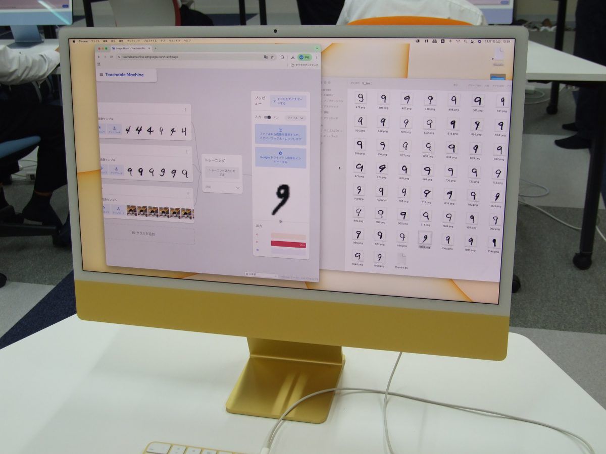 左は元の画像を処理し、背景を変えたり、余計なものを消したりする画像処理を体験しました。右はAIについて実際に手書きの数字をAIが判別できるか体験する実習でした。情報工学科ではAI学習のために特別に導入したコンピュータが導入されており、AIを学ぶためには最高の環境です。