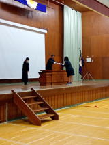 生徒総会をリモートにて行いました。3年生から2年生へ生徒会が引き継がれました。
