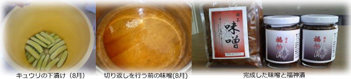 味噌を仕込んだのは今年の4~5月、半年以上熟成させています。収穫祝の豚汁にも使用しました。福神漬は8月からナスやキュウリの下漬を行い、ダイコン・レンコン・ショウガとともに調味液に漬けたものです。