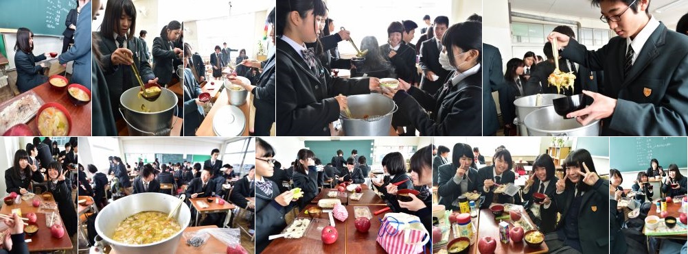 各クラスでは、机を向い合せたり、先生や生徒でみんなの分のトン汁を装う(よそう)などクラス毎のカラーが出ていました。トン汁のお椀は各自が持ち寄ったので、大小さまざま、おかわりも自由で、満腹のようでした。