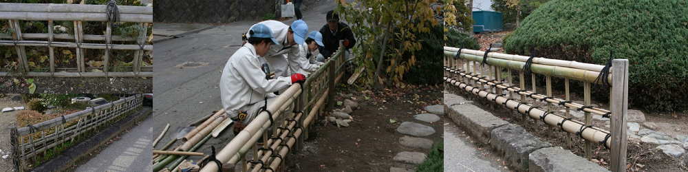 現在課題研究の時間を用いて、『袖垣』の製作を行っております。 放課後も利用しながら、完成までに約40時間かかりました。 袖垣とは、縁先の端などに建物の柱や壁から庭に向かって短く突き出した竹垣を袖垣と称し、建仁寺垣、鉄砲垣をはじめ様々な種類の竹垣が多様に応用されます。
