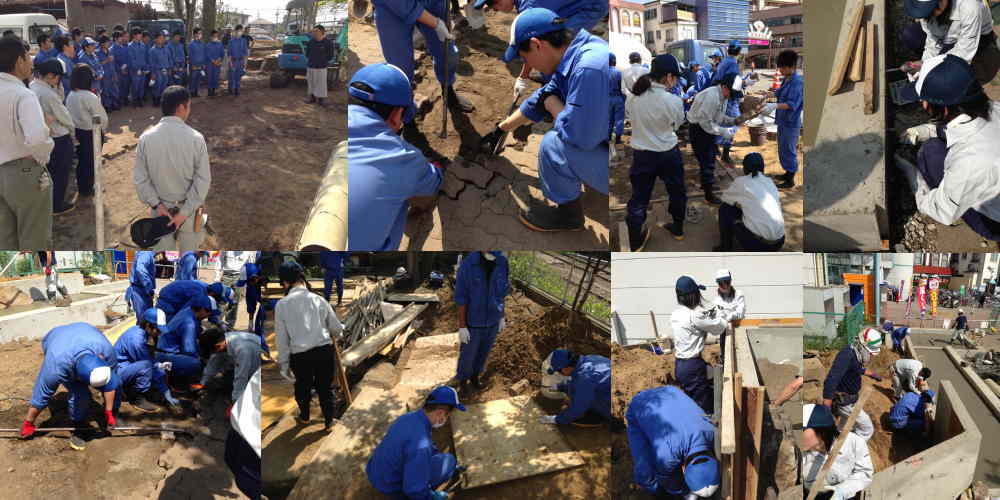 須坂駅イオン前の庭園整備の第4回現場実習について報告します。第4回目の現場実習は5月21日(火)に実施しました。 作業は、庭園整備計画予定地のカスケード・カナール護岸の型枠除去作業・花壇基礎のインターロッキング除去作業です。 参加生徒は、緑地計画コース3年生15名、造園技術コース3年生18名の合計33名です。 学校を13:35に出発し、13:45〜15:15まで現場作業を行いました。始めに、第一緑地株式会社職長の宮下氏からご挨拶をいただき、生徒を代表して緑地計画コース菅沼が挨拶を行いました。