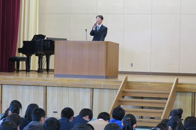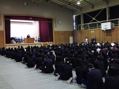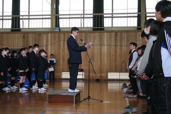 | 3月22日 離任式・終業式 令和5年度後期終業式と離任式を行いました。 校長先生より、石川県の小松大谷高校と星稜高校の地区予選決勝で星稜高校が8点ビハインドから逆転勝ちをした様子から、「笑顔」がもたらす力についてお話がありました。 苦しかったり、不安な時でも、「笑顔」でいることで自分自身も周りの人たちも力を発揮できることがあります。 春は出会いと別れの季節です。周りの環境が変わり不安になることもあるかもしれません。「笑顔」を意識して新学期を迎えましょう。 |