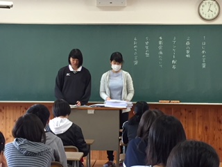 | 1月12日 3学年前期特編授業 課題研究発表会 3学年課題研究講座の生徒が、自らの目指す職業について研究発表を行いました。 現在SDG's(持続可能な開発目標)にあげられている目標を達成するために、目指す職業に就き働く自分が貢献できることは何かをまとめ、発表しました。 製造業に携わる仕事に就くことを目指している女子生徒は、SDG’s目標5「ジェンダー平等を実現しよう」を選択し、現在の製造業における女性の就職率の低さを課題としてあげ、製造業のイメージをもっと女性が活躍しやすいイメージに変えていきたいと話しました。 将来の自分がどのように社会に貢献していけるのかを具体的に述べることができる素晴らしい研究発表でした。 |