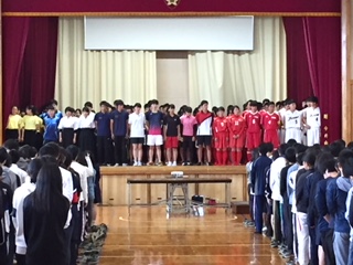 | 県大会に出場する、サッカー女子・サッカー男子・ソフトテニス・テニス男子・テニス女子 陸上・卓球・弓道・新体操・かるたのみなさんへエールが送られました。 |