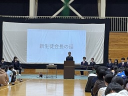 4月9日 新入生歓迎会 生徒会主催の新入生歓迎が行われました。 委員会や部活動の活動内容の紹介の後、生徒会役員から1年生へ校歌合唱が贈られました。 また、放課後には書道部から1年生へ書道パフォーマンスが贈られました。 1年生は、ぜひ生徒会活動に積極的に参加し、学年を超えた縦の繋がりを大切にして欲しいです。 生徒会作成ページ 新入生歓迎、生徒会長から1年生へのメッセージはこちら |