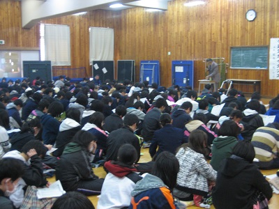 | 化学教室より出火した想定で、小体育館へ避難しました。 | |