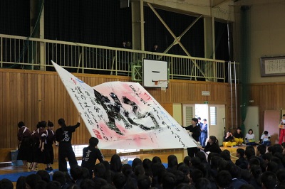 | お昼に書道パフォーマンスが行われました。 パフォーマンス終了後、3年生へ花束が贈られました。 |