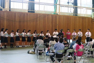 | 3年生は最後の音楽会。 クラスの団結を歌声で表現してくれました。 (写真は優勝した3年2部) |