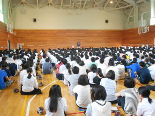 9月17日(木) 生徒会立会演説会 選挙 生徒会長候補と副会長候補が立会演説を行いました。演説会後の投票では1、実際に用いられる投票箱等を市からお借りして投票が行われました。 |