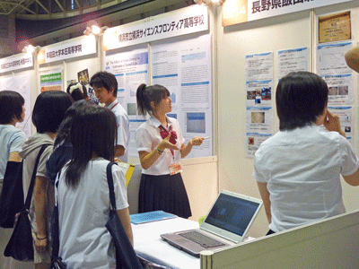 8月3日(火)・4日(水)に パシフィコ横浜にて開催された 平成22年度SSH生徒研究発表会に、本校から理数科3年生2名、2年生6名が参加しました。2008年度ノーベル物理学賞受賞者である 益川敏英京都産業大学教授の講演や、他のSSH校による高度な内容の発表を目の当たりにして、本校生徒達は今後の研究への意欲をかき立てられたようでした。本校生徒によるポスター発表「シロアリの軌跡 〜ヤマトシロアリの道しるべ フェロモン生産について〜」のブースには大勢の方々が足を止め、熱心に耳を傾けていました。