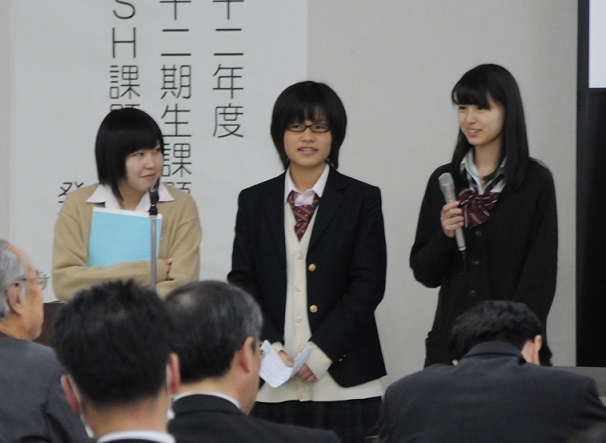 3月22日(火)に、平成22年度SSH課題研究発表会が、飯山市民会館において開催されました。発表を行った理数科 2年4組の生徒は、グループや個人で、SS2の時間を中心に研究に取り組んできました。今年度は、文部科学省より SSH の指定を受け、大学・研究機関・企業等との連携が一層強化される中で、研究の内容や質を充実させることが出来ました。質疑応答の場面では専門的な質問に対しても堂々と自分の考察を述べるなど、1年間で大きく成長した生徒の姿を見ることができました。