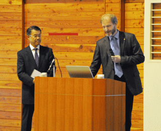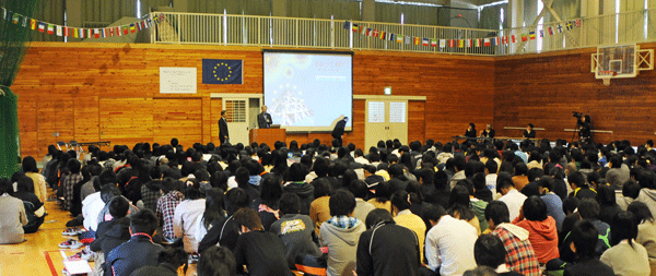 5月10日(火)に、 SS1, SS2, SS3 の共通企画として、ドイツ大使館参事官・農学博士の ウルリヒ・ファスベンダー先生をお迎えして、「EUがあなたの学校にやってくる」をテーマとして、全校生徒を対象に講演をしていただきました。ファスベンダー先生は、加盟27カ国に及ぶ EUの面積・人口・使用言語などから始まって、その形成過程や、統合の歴史的背景について、丁寧に解説して下さいました。講演は日本とEUとの交流や、京都議定書などの環境問題にも及び、双方のグローバルな協力関係の重要性を指摘されました。
