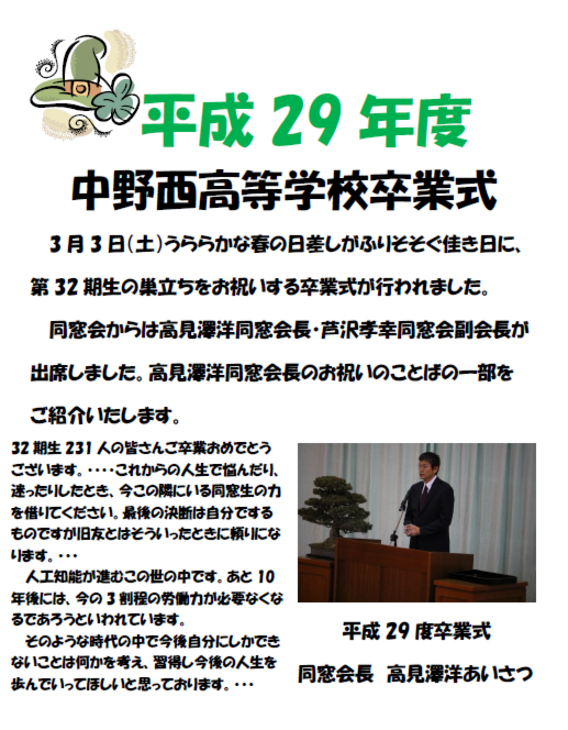 卒業生の皆さんにお願いしたいことがあります。高校時代に切磋琢磨したこの仲間を大事にして欲しい、ということ。今後、必ず、力になってくれる時が来るはずです。自分は今まさにそれを感じありがたく思っています。これからは、皆さんも同窓会の一員です。同窓会の活動にも協力いただき、また、近い将来ご自分の子供の卒業式に出席するように、この中西を盛り立てていきましょう。