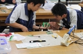 2年生で製作するライントレースロボットに取り付けるセンサや直流(DC)モータ、ギヤの原理について学習していきます。センサは赤外光の特性をどのように利用すれば色を識別できるのか。駆動部分であるモータやギヤの性質など、実験を通して知識を深めていきます。