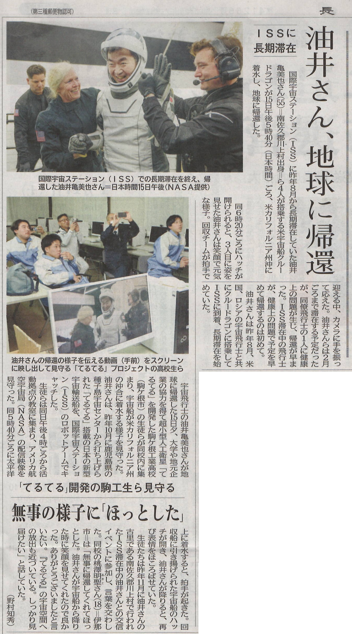長野日報に宇宙航空研究グループの記事が掲載されました