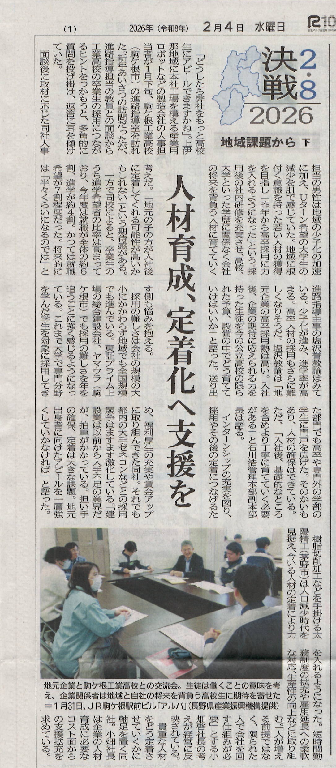 長野日報に人材育成に係る取組として、地元企業と駒工生の交流が紹介されました