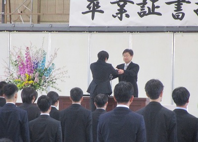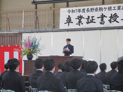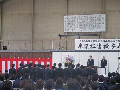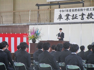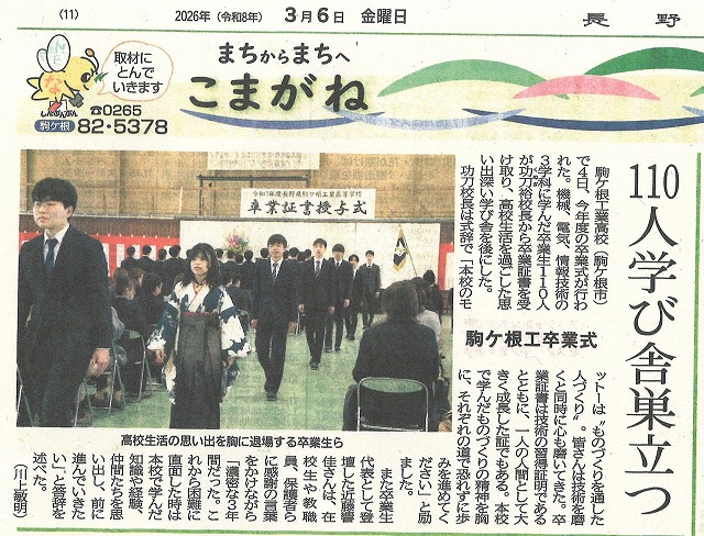 令和7年度卒業式を行いました 3月4日(水)に卒業式が行われました。本年度は機械科39名、電気科34名、情報技術科37名が卒業証書を授与されました。 卒業生は学科ごとに担任の先生より呼名をされて起立しました 学科の代表生徒が卒業証書を校長先生より授与されました 在校生代表の送辞 卒業生代表の答辞 卒業生一同からの記念品贈呈 卒業記念品のテント 機械科の課題研究で製作した『駒』の焼き印を押したどらやきを卒業生全員に配りました。 長野日報(令和8年3月6日) (記事をクリックすると別画面に拡大表示されます)