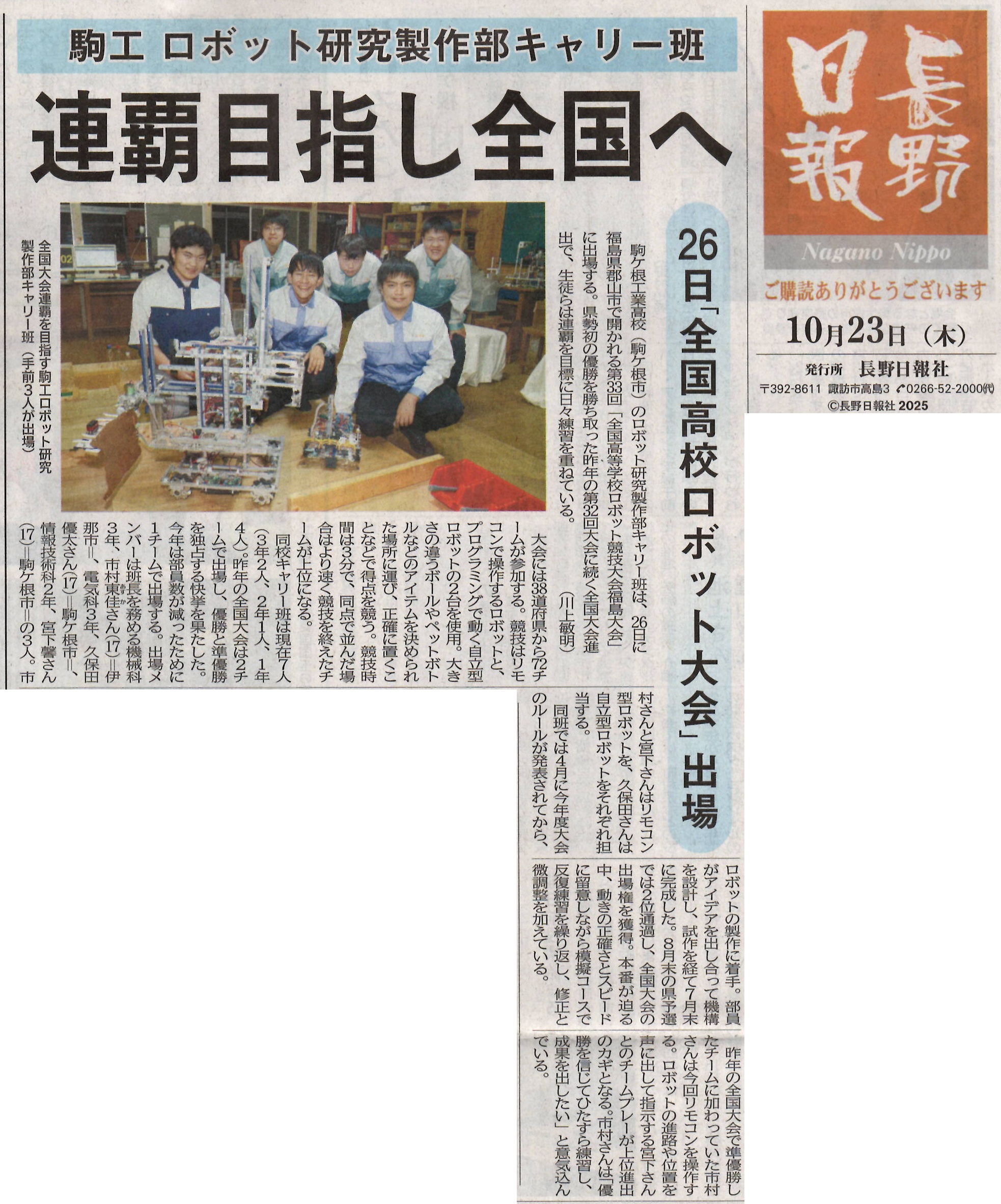 長野日報にロボット研究製作部キャリー班の全国大会出場が掲載されました