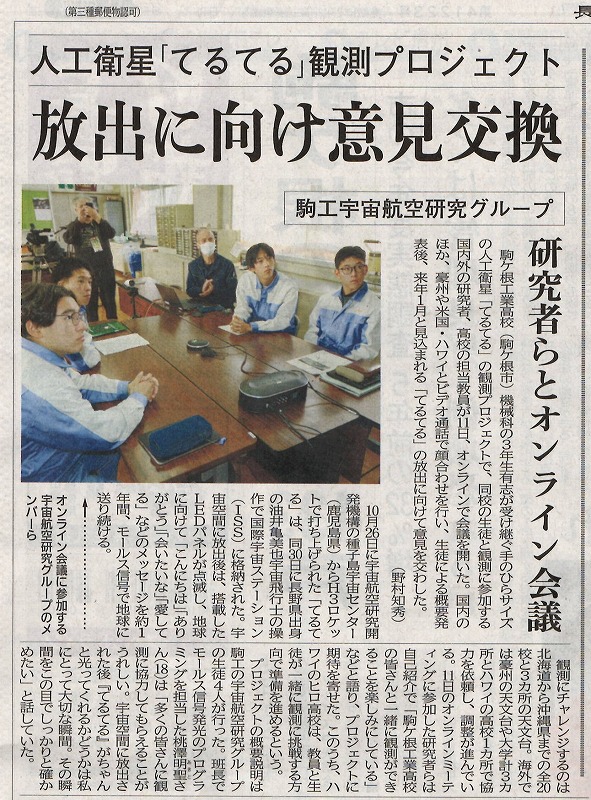 長野日報に人工衛星「てるてる」観測プロジェクトの記事が掲載されました