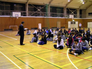 授業の途中で訓練放送が入り、体育館に避難 教頭先生より、訓練の講評がありました