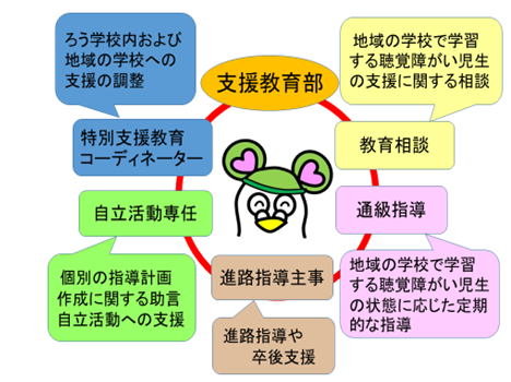 (1)本校の乳幼児、児童、生徒や地域で生活している聴覚に障がいのある乳幼児、児童、生徒、成人及び、関わる人々の教育的ニーズに対応するための指導、支援、相談を行っています。(2)医療、福祉、労働、地域との連携をはかり聴覚障がい教育のセンター的機能を果たしています。(3)支援教育部は、特別支援教育コーディネーター、自立活動専任、教育相談専任、通級指導担当、進路指導主事で構成され、業務はそれぞれが独自に行いますが、必要に応じて部内で協働したり、分担したりしています。