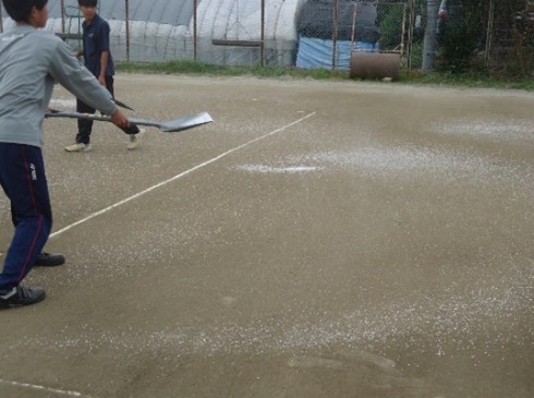 テニスコートに塩化カルシウムを撒いて、コートを固める作業をソフトテニス部員8名と顧問2名で実施しました。![]() ![]() 購入していただいた塩化カルシウムは数回に分けてコートに入れるように計画し、初回は20袋を撒くことにしました。撒き方の見本を示してから各自均等に撒くにはどうやったら良いか考えながら撒き、写真3のように撒くことができました。また、自分たちで使用するコートなので、より良い状態を保とうとする姿勢も感じられました。 ![]() ![]() ![]() 上記の作業を行うことでコートがより固まり、練習にもしっかり打ち込めるようになり、大会で入賞できるよう張り切って部員も活動しています。 |