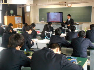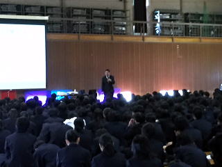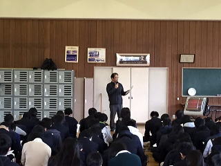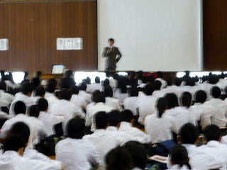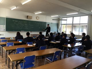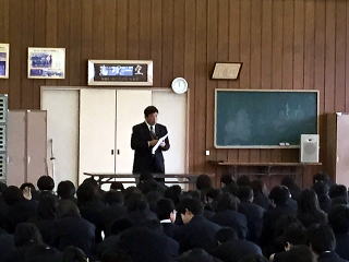 この日の5,6時間目を使って1・2学年合同で進路講話が行われました。「幸せな人生」を歩むためには、どんな心づもりで日々を過ごしていくのか。働くとはどういうことなのか。熱い口調で生徒に問いかけていました。