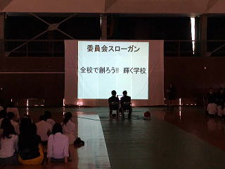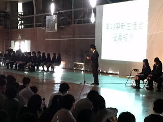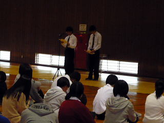 新生徒会役員を決める立会演説会が行われました。生徒会長1名、生徒会副会長2名、議長1名、副議長1名がそれぞれ抱負を述べました。選挙結果、全員が信任されました。
