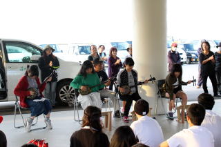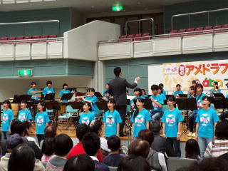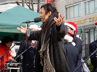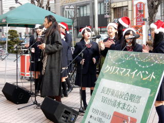 本校同窓生の清水まなぶさんと合唱部員が長野の東急前で歌のイベントを行いました。