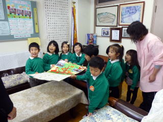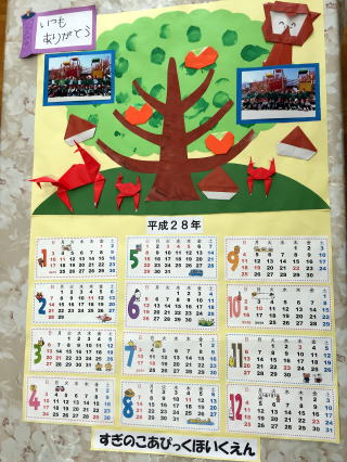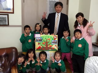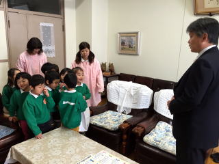 11月23日の勤労感謝の日に合わせて、本校隣にある保育園より手作りのカレンダーを頂きました。幼児9名と先生2人で来校され、校長室で「ありがとうございます。」と大きな声が響きました。