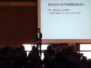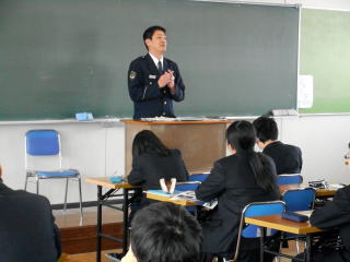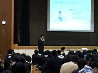JAF長野支部事業課交通環境係の金子公一先生が「危険予知による交通安全」の演題で講演をされました。長野東高校の生徒は9割位が自転車で登校するため、加害者、被害者にならないためにどうすればいいのか真剣に聞いていました。