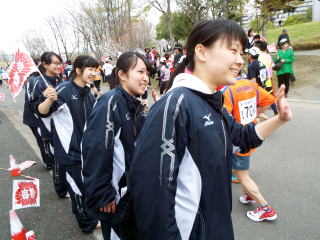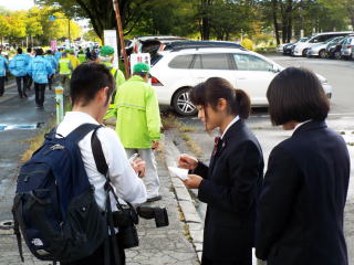 第27回長野マラソンに本校の生徒が大勢ボランティアに参加しました。生徒会が呼びかけた一般ボランティアは「Mウェーブ」「タカチホ前」「ホワイトリング」の3カ所で95人が参加、給水ボランティアとして、飲料やバナナなどを選手に手渡し声援を送りました。その他、吹奏楽部はMウェーブで応援演奏、陸上部はスタート及びゴール地点などでの補助員として活躍しました。