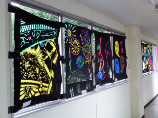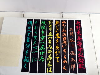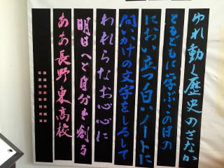 正面玄関を入って右側に展示されていた書道部の共同制作作品が10年ぶりに新しいものに掛け替えられました(以前の作品は平成17年度制作)。今回飾られたのは、今年の東雲祭で展示された書道部の共同制作作品で、15色を使って書いた校歌。とてもカラフルになり、来校したお客様を迎えてくれる華やかに作品となりました。