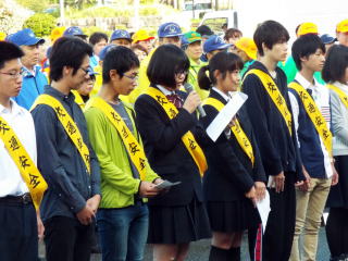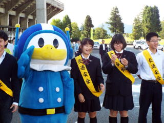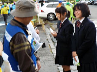 21日から始まる秋の交通安全運動の出発式が、東和田運動公園で行われました。本校からは、校紀安全委員長の早川さん、副委員長の倉島さんが参加しました。式の後、会場付近で交通安全を呼びかけるリーフレットを配りました。