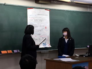 1月18日の「しののめお仕事塾」(様々な職種の方々からお話を聞いて生徒自身の将来を考える)を受けて、学んだことを発表しました。事前に模造紙やパワーポイントを作成し、各々クラスでプレゼンテーションを行いました。発表後には生徒から質問もあり、またきちんと自分の言葉で答えていて、実りある研究報告会になりました。