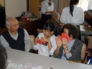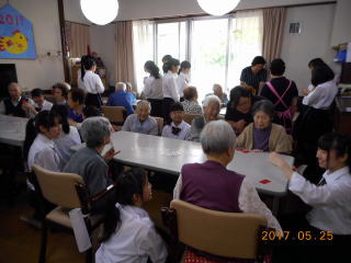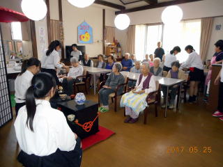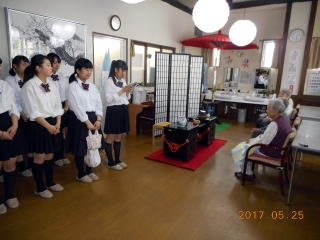 この日の中間考査の後、茶道部の1,2年生16名が宅老所「いっぷく」を訪れ、利用者の方々にお点前を披露しました。毎年恒例となった茶道部の訪問を皆さん喜んでくれたようでした。お点前以外にもトランプでの交流もあり、笑顔の輪が広がりました。